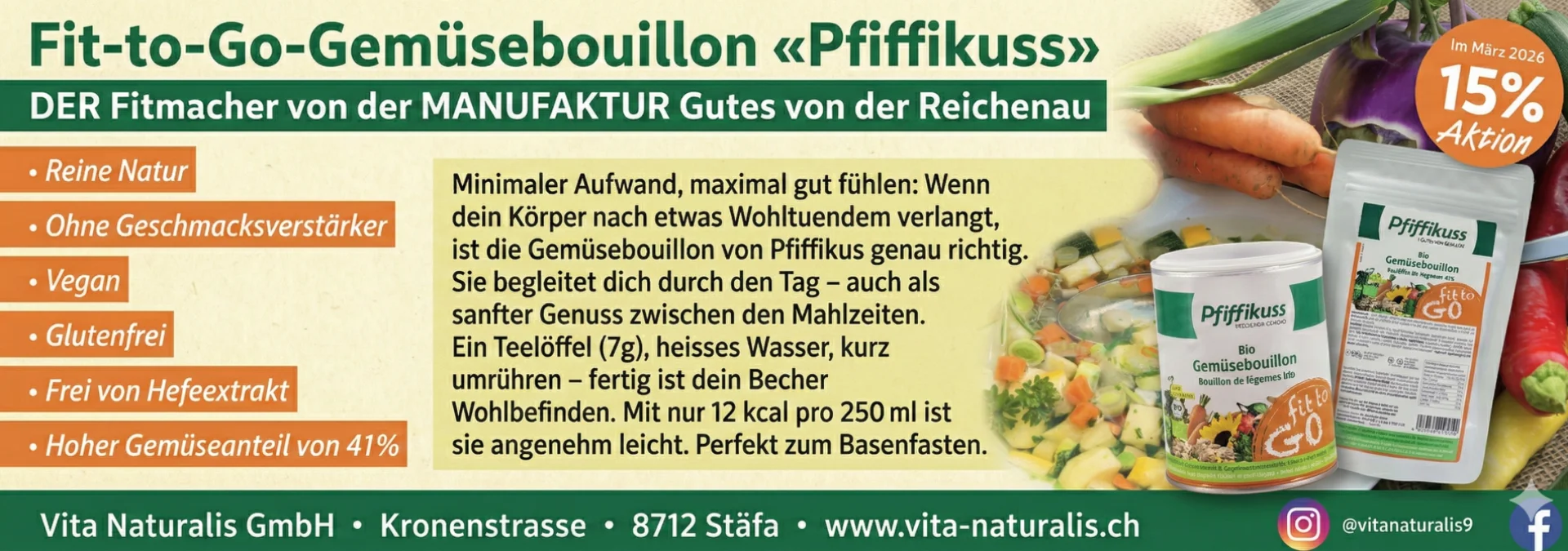 Neu gibt es die Bio Bouillon fit to go – ein neuer Trend aus New York & London, dem wir folgen. Einfach Gemüsebouillon trinken als Fitnessgetränk und für Ihr allgemeines Wohlbefinden. Und wenn Sie unsere Bouillon als Bouilon suchen, dann finden Sie uns auch. Auch zwischen den Mahlzeiten eine Pfiffikuss Gemüsebouillon – der Fitmacher von der Insel, basisch, wohlschmeckend und entschlackend, Auch für die Gewichtsreduktion und Fastenkur geeignet.